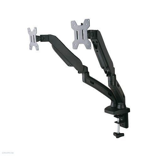 Dual monitortartó. Gázdugattyú a terhelés kiegyenlítésére. Min.képernyő átmérő: 13”. Max. képernyő átmérő: 32”. Dőlés: +/-45°. Elfordítás: +/-90°. Forgatás: 360°. A TV tájolása: landscape/portré. Rögzítés: peremre/ nyílásba. Üzemi terhelés: 2x 1 - 7 kg. VESA 75x75. VESA 100x100. Szín: fekete. Anyag: acél/Alumínium. ”Biztosíték” kiiktatás ellen.