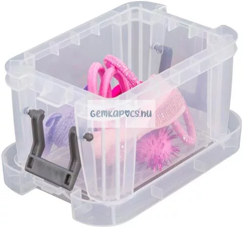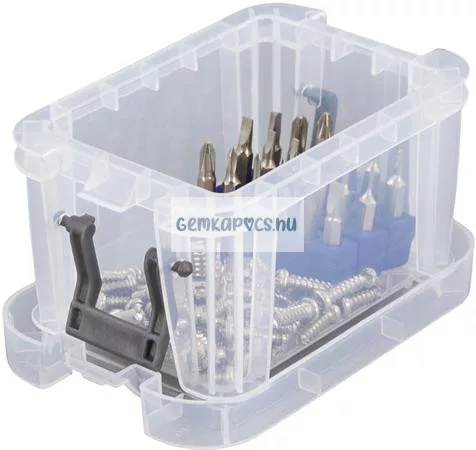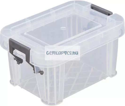 Tetővel és fogantyúkkal ellátott víztiszta műanyag doboz rápattintható fedéllel.