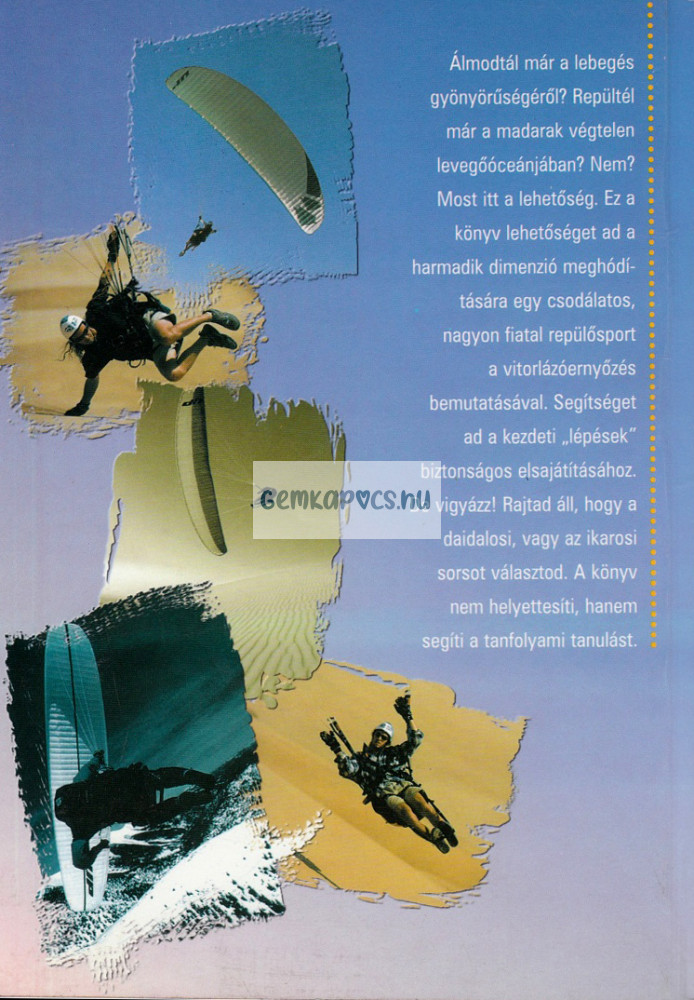 Ez a könyv lehetőséget ad a harmadik dimenzió meghódítására egy csodálatos, nagyon fiatal repülősport a vitorlázóernyőzés bemutatásával. segítséget ad a kezdeti lépések biztonságos elsajításához. De vigyázz! Rajtad áll, hogy a daidalosi, vagy az ikarosi sorsot választod.