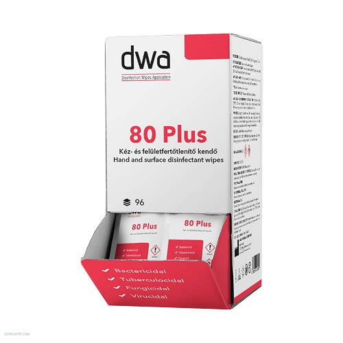 A DWA 80 plus fertőtlenítő törlőkendő higiénés kézfertőtlenítésre valamint, alkoholálló felületek fertőtlenítésére alkalmazható: Baktericid, Fungicid, Virucid, Tuberkolocid hatású. Alkalmazási koncentrációk, behatási idő: Baktericid hatás: 0,5 perc, Fungicid hatás: 0,5 perc, Virucid hatás: min. 1 perc, Tuberkulocid hatás: min. 1 perc.