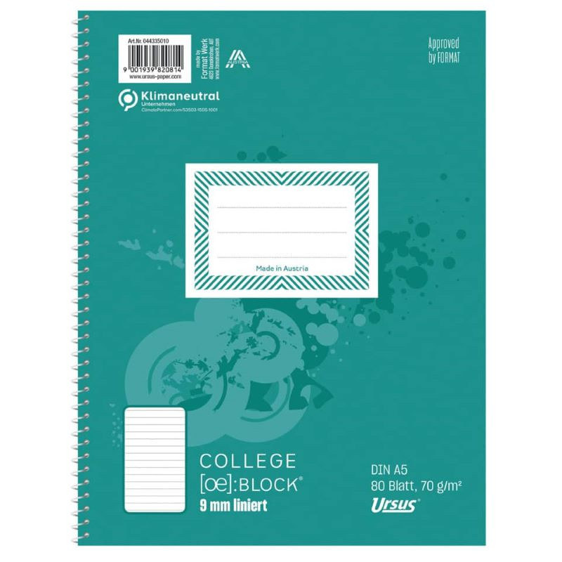Az Ursus Collegeblock A5-ös vonalas spirálfüzet, merev fedlappal, fémspirállal.