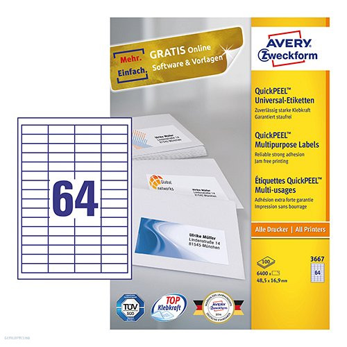 Etikett címke univerzális 3667 fehér QuickPEEL 48,5 x 16,9 mm 100 ív Avery