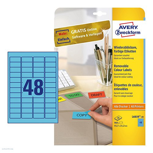 Etikett címke speciális L6039-20 visszaszedhető kék 45,7 x 21,2 mm 20 ív Avery