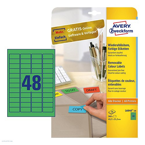 Etikett címke speciális L6040-20 visszaszedhető zöld 45,7 x 21,2 mm 20 ív Avery