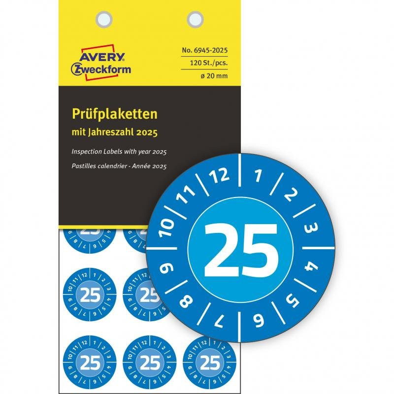 Eltávolíthatatlan Avery 2025-ös évszámú öntapadó plakettek.