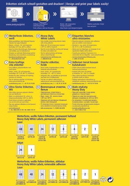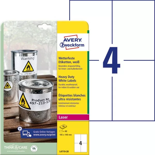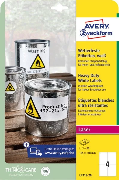 Etikett címke speciális időjárásálló poliészter 105x148mm 20ív Avery fehér