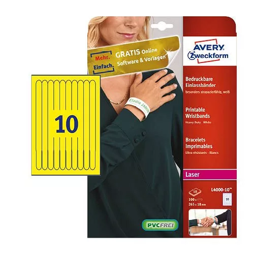 Etikett nyomtatható karszalag 265x18mmAvery 100db/dob sárga