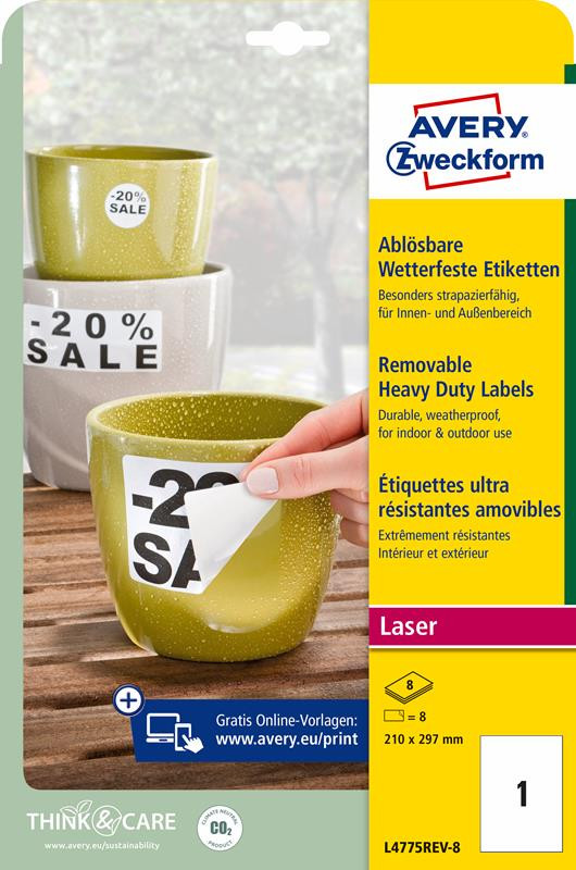 Etikett címke speciális L4775REV-8 visszaszedhető időjárásálló poliészter 210x297mm 8ív fehér Avery fehér