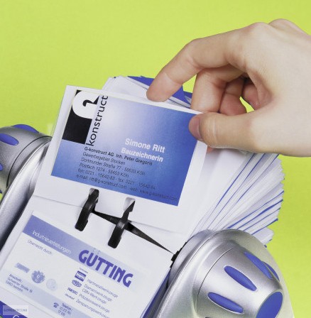 400 db névjegykártya tárolására alkalmas forgatható tartó.