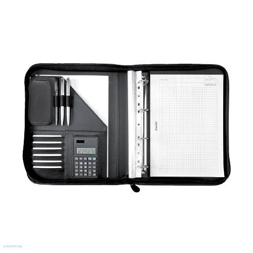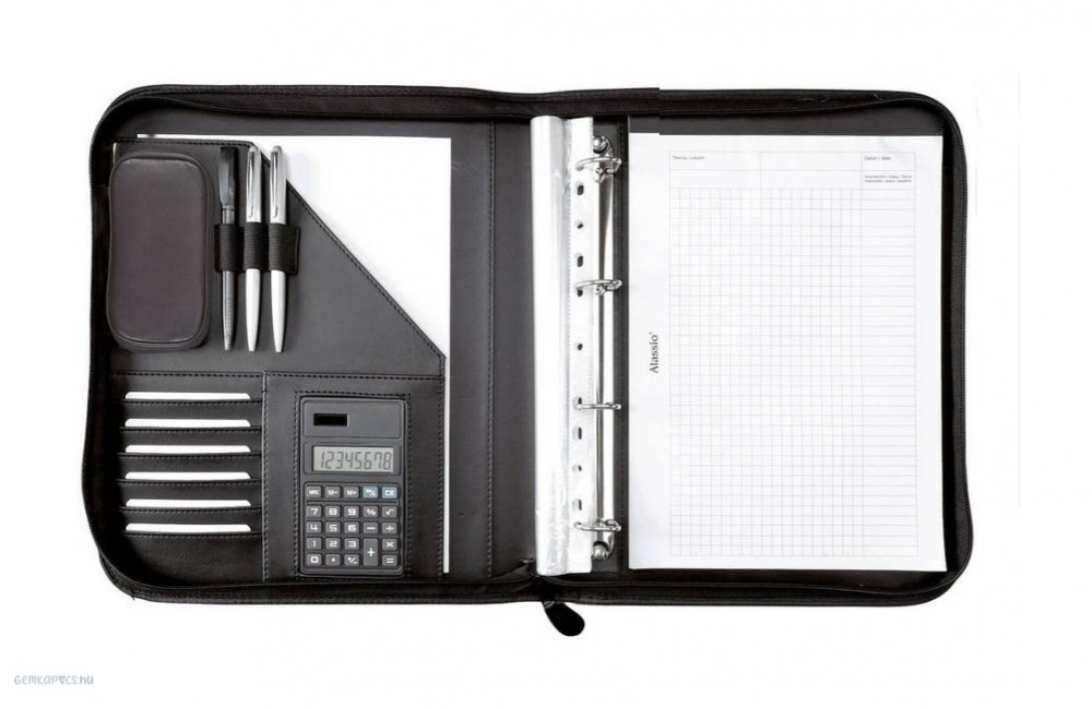 Tartalma: számológép, cipzáras rekesz (pl. mobil töltő kábelnek), jegyzetblokk, 6 db névjegykártyarekesz, 3 írószertartó, fogantyú.