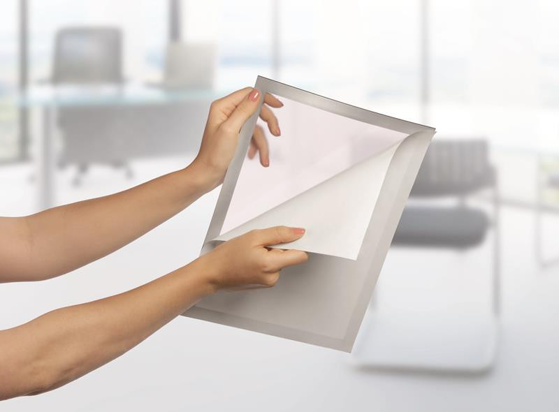 Duraframe keret, öntapadó hátlappal és mágneses előlappal. Duraframe segítségével profin és kényelmesen helyezhetjük ki dokumentumainkat. Egyszerűen vegyük le a védőfóliát és ragasszuk fel az öntapadó keretet bármilyen sima, kemény felületre, például ablakra, iratszekrényre vagy ajtóra.