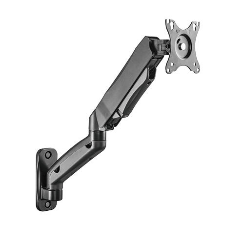 Single monitortartó. Gázdugattyú a terhelés kiegyenlítésére. Min. képernyő átmérő: 13””. Max. képernyő átmérő: 32””. Dőlés: +90°/-45°. Elfordítás: +/-90°. Forgatás: +/-180°. A TV tájolása: landscape/portré. Rögzítés: falra szereléshez. Üzemi terhelés: 2 – 9 kg. VESA 75x75. VESA 100x100. Szín: Fekete. Anyag: Acél/ Alumínium. Biztosíték kiiktatás ellen.