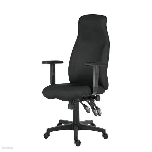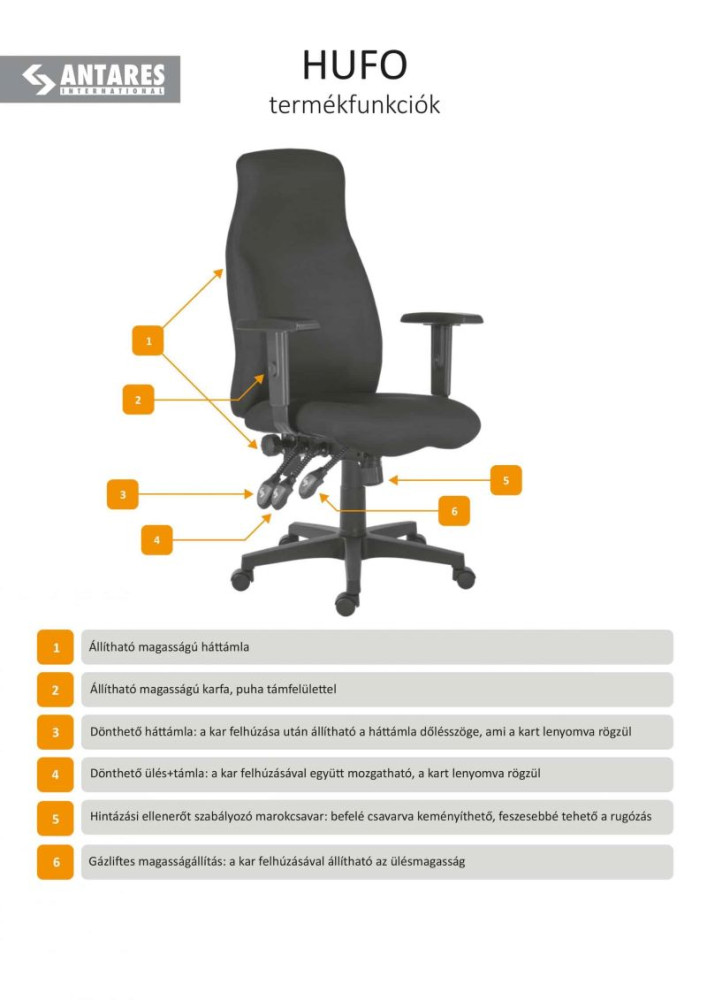 Magas, ergonomikus kialakítású, dús és tartós szivacsozású, állítható magasságú háttámlával.