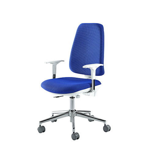 Magasságban állítható, dönthető, magas, formázott háttámlájú forgószék fehér burkolattal.