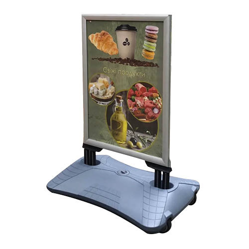 Plakátméret A1, tükröződésmentes PVC fóliával, kipattintható kerettel. A talp szürke színű, beépített kerekeken gördíthető.