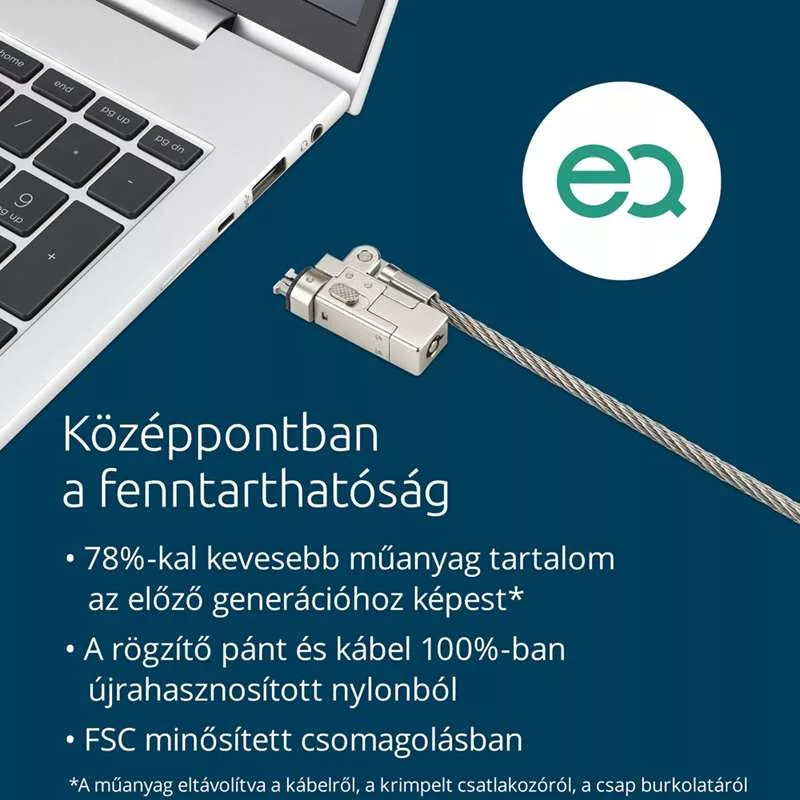 A Kensington Slim NanoSaver® 2.0 EQ kulcsos laptopzár ideális az ultravékony és a 2 az 1-ben eszközökhöz. Ez a laptopzár mindössze 7,5 g műanyagot tartalmaz az előző generációs 36 g-mal szemben, ami 78%-os műanyagcsökkenést jelent.