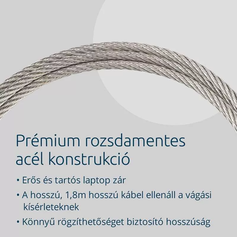 Erős és tartós kiegészítő, amely kiegészíti a modern munkaterületeket. A hosszú, 1,8 méteres kábel ellenáll a vágási kísérleteknek, és elegendő hosszúságot biztosít a laptop egyszerű rögzítéséhez az asztalokhoz, asztalokhoz és egyéb rögzítési pontokhoz.