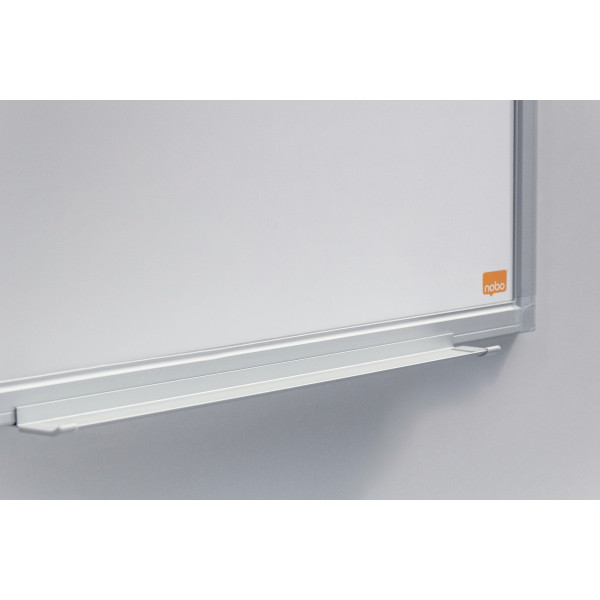 Nobo Essentials mágneses acél fehértábla, tartós és könnyen tisztítható felülettel, 12 mm-es eloxált alumínium szegéllyel és praktikus tolltartó tálcával.