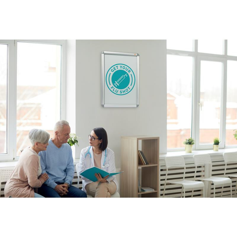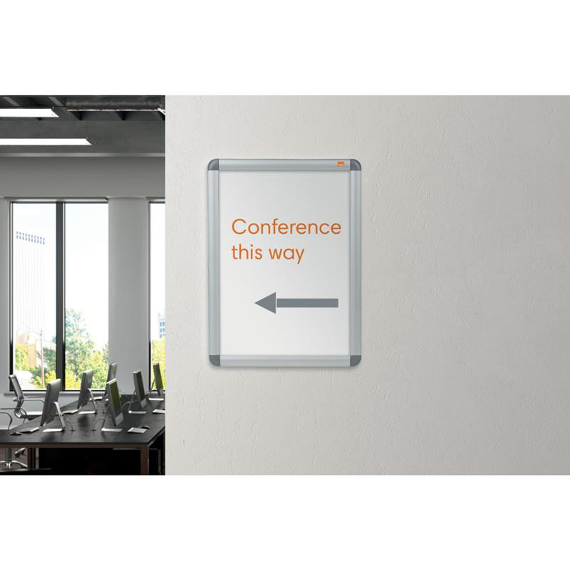 Falra szerelhető plakátkeret plakátok, táblák és információk anyagok kihelyezésére. Az alumínium pattintható keret professzionális megjelenést biztosít, és lehetővé teszi a tartalom gyors és egyszerű cseréjét. Sima lekerekített sarkok a kényelmes használat érdekében.