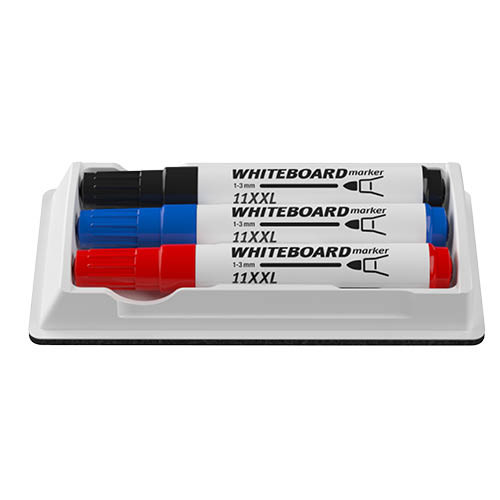 3 különböző színű táblamarkerrel (kék, piros, fekete) és filc törlőfelülettel.