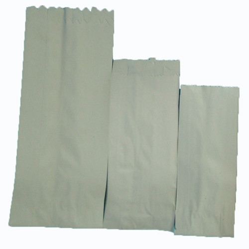 Redős kialakítású, szürkésfehér papírzacskó kisebb termékek csomagolására.