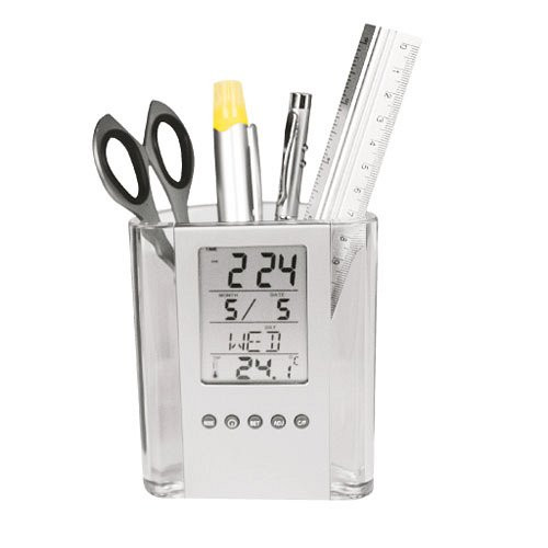 Akril asztali írószertartó, órával, ébresztővel, dátum és napok jelzővel, hőmérővel.