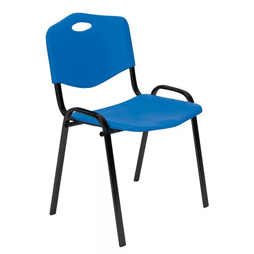Festett fekete acélvázas tárgyalószék kék, fekete, piros és fehér műanyag ülőlappal.