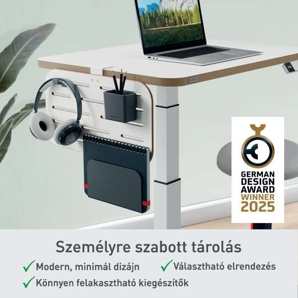 A Németországban tervezett és a legtöbb 35 mm-es maximális asztallapvastagságú íróasztallal kompatibilis, könnyen felszerelhető függőleges rendszerező értékes kiegészítője a Leitz Ergo ülő-álló asztalnak. A 8 mm vastag MDF tábla szilárd és stabil alapot biztosít, a puha gumipárnák pedig védik az asztal felületét a karcolásoktól.