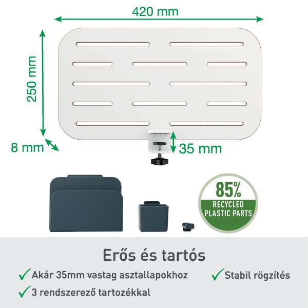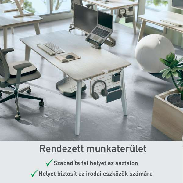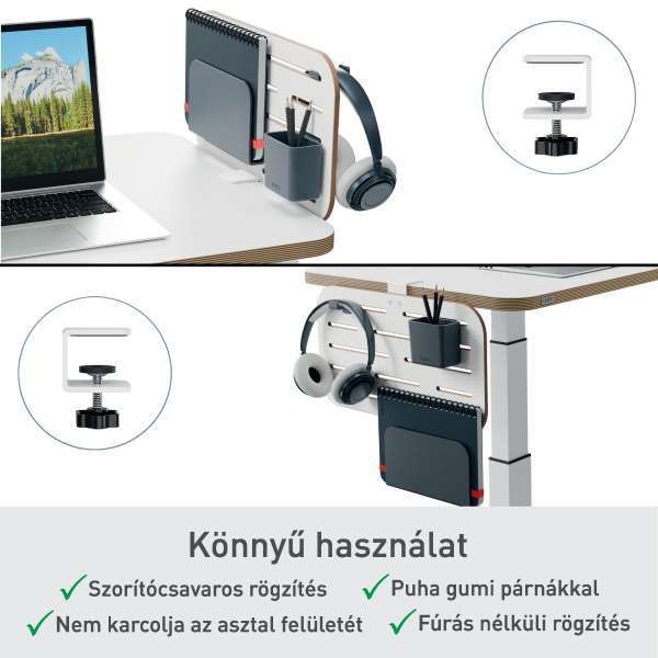 Tartsd minden lényeges eszközödet kéznél, rendezetten, és szabadíts fel értékes helyet az asztalon. Egyszerűen helyezd az erős, 85%-ban újrahasznosított műanyagból készült tárolótartozékokat (1 x füzettartó, 1 x tolltartó és 1 x fejhallgató akasztó) a táblára és hozd létre saját, személyre szabott munkaterületedet.