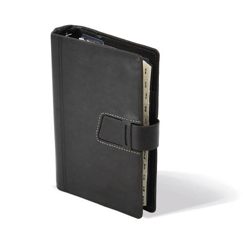 Elegáns, bőrhatású műbőrből készült, fehér varrással díszített, bedugófüllel záródó Saturnus M221 kalendárium.