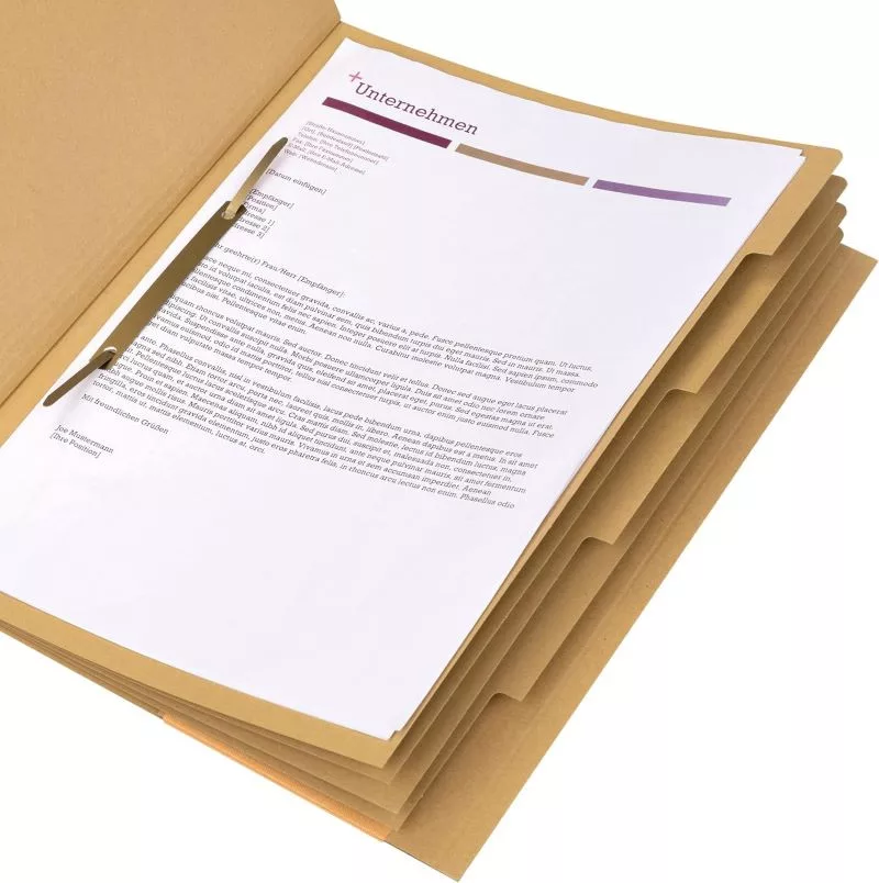 fémfülekkel rögzíthető, V-profilú gerinc, változtatható címkeállás, feliratozható, 1 zseb lyukasztás nélküli dokumentumoknak, 4 elválasztott rekesz