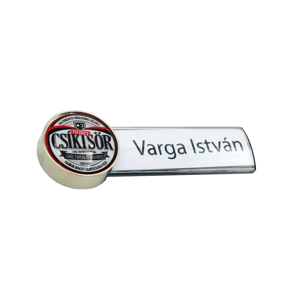 A rögzítő mágnes akár vastagabb textilen is (trikó, ing, zakó, kabát) stabilan tartja a névkitűzőt. A mágnes rögzítéssel nem sérül vagy roncsolódik a ruházat anyaga.