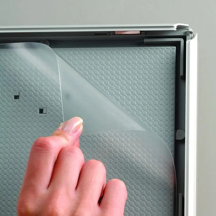 Könnyen cserélhető tartalom: A pattintós keretnek köszönhetően a nyomtatott információ gyorsan és egyszerűen frissíthető.
