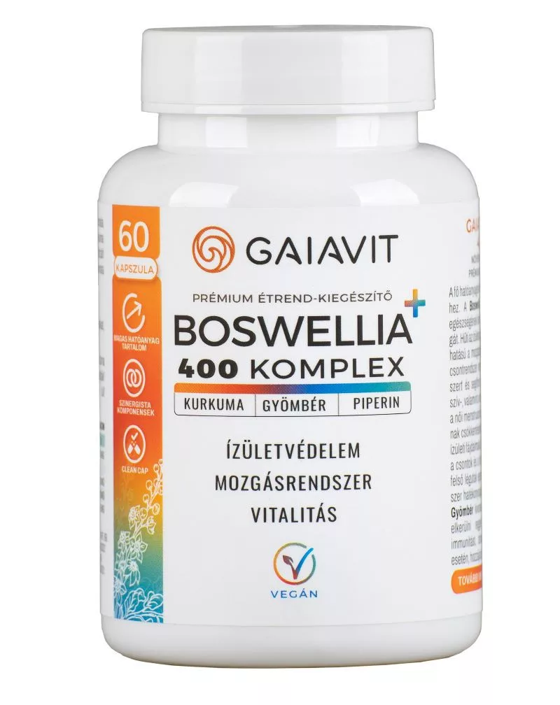 Gaiavit Boswellia+ 400 komplex növényi kivonatokat tartalmazó prémium étrend-kiegészítő kapszula fő hatóanyagai mind hozzájárulnak az ízületek egészségének megőrzéséhez és rugalmasságához.