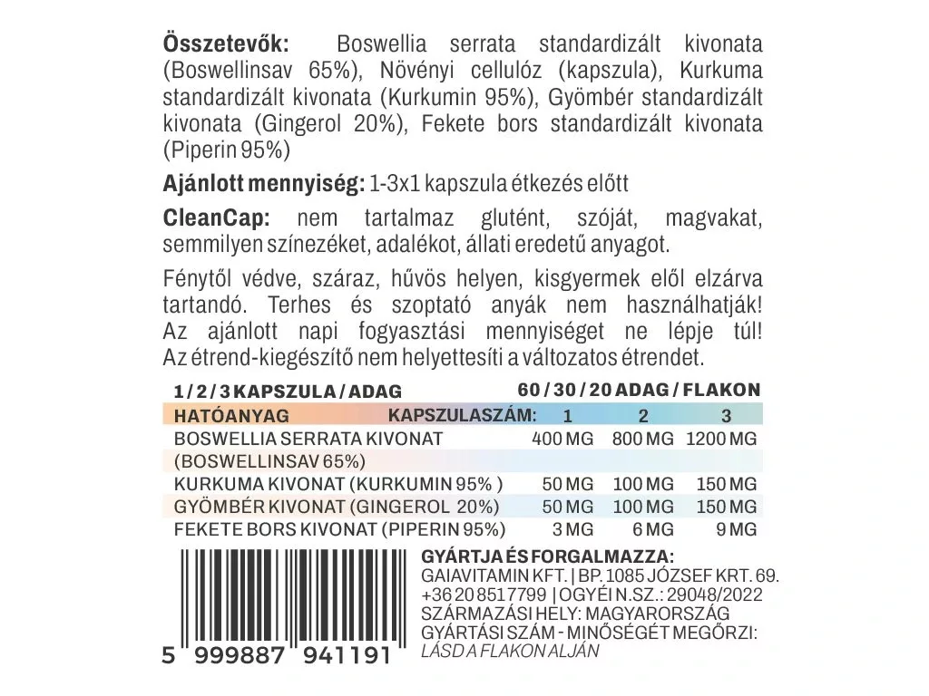 • Boswellia kivonat (Boswellin sav 65%) 300 mg,