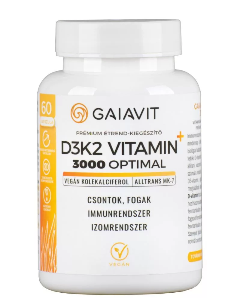 Gaiavit D3K2 vitamin+ 3000 Optimal vitaminokat és magnéziumot tartalmazó prémium étrend-kiegészítő kapszula.